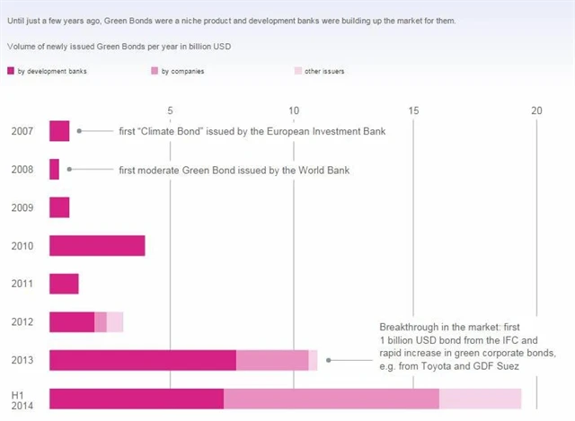 Zelené dluhopisy patřily ještě nedávno k okrajovým záležitostem. První zelené bondy vydala v roce 2007 Evropská investiční banka. Zlomový byl ale až rok 2013, kdy hodnota jediné emise zelených dluhopisů vydaných Mezinárodní finanční korporací (IFC) přesáhla miliardu dolarů.
