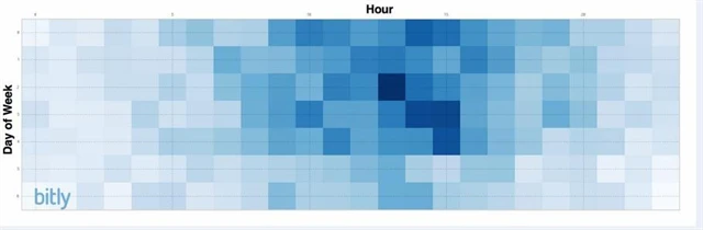 Následující mapa společnosti bit.ly znázorňuje, ve které dny a hodiny se na internetu pohybuje nejvíce lidí (čím modřejší, tím více uživatelů sociálních sítí).