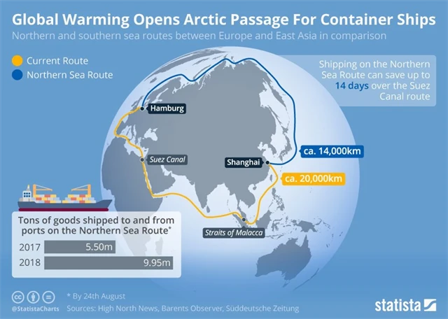 Nejběžnější námořní obchodní trasa spojující západní Evropu s jihovýchodní Asií (třeba z Hamburku do Šanghaje) přes Suezský průplav měří 20 tisíc kilometrů. Severní cesta, která vede na sever od Sibiře, má jen 14 tisíc kilometrů. Onen šestitisícový rozdíl představuje zhruba čtrnáct dnů cesty.