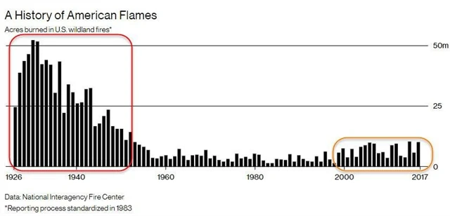 Podle statistik, jež dal Mass dohromady (a jež s obvyklou dávkou škodolibosti zveřejnil blog Zero Hedge), jsou současné požáry legrace ve srovnání s tím, jak umělo hořet před sto či osmdesáti lety. Graf to řekne lépe než tisíc slov.