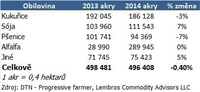 Změny v zemědělském zákoně o snížení dotací rolníkům s nejvyššími příjmy ani navrhované omezení výroby ethanolu v roce 2014 ale překvapivě nehrají ve výhledech farmářů tak významnou roli, jsou až na pátém a šestém místě mezi faktory, které ovlivňují jejich rozhodování. Podle společnosti DTN/The Progressive Farmer, která prováděla průzkum mezi 120 firmami z oboru, jsou to ze dvou třetin vliv počasí a velikost zásob a na třetím místě rozsah zahraniční poptávky po domácí produkci, co rozhoduje o velikosti plánovaného osevu. Do jaké míry se tedy očekává změna u jednotlivých obilovin oproti roku 2013?