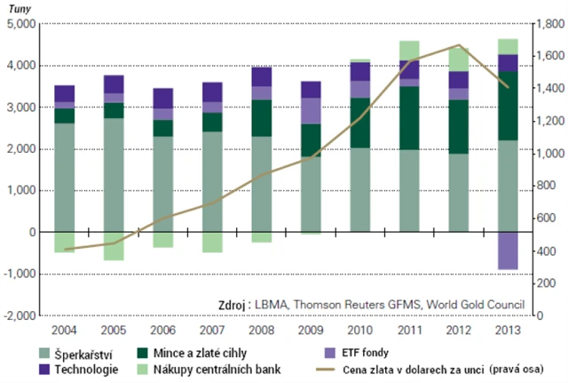 Cena zlata v roce 2013 propadla o celých 21 % i přes rekordní o 21 % vyšší poptávku po fyzickém zlatě (bez ETF). Hlavními viníky byly právě burzovně obchodované fondy, které snížily své zásoby o 881 tun. Celkové nákupy byly kvůli ETF meziročně o 15 % nižší a činily 3 756 tun. Celková nabídka se meziročně snížila o 2 %, když dosáhla 4 340 tun.