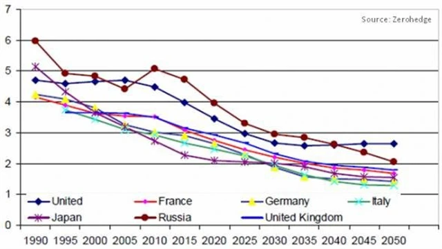 Vyspělé země nastoupily již před mnoha lety trend, který se jim nepodaří zvrátit dlouhá desetiletí - ubývá lidí v produktivním věku při současném prodlužování věku dožití. Stárnoucí populace dává vzniknout řadě fenoménů, například větší spotřebě léků. Jak je vidět na grafu, výhled pro vyspělé země a Rusko není příliš příznivý - kromě USA, kde svůj pozitivní vliv má sehrát přistěhovalectví, se má ve všech zemích snižovat počet lidí, kteří pracují na jednoho důchodce.