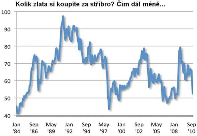 Kolik uncí stříbra potřebujete k zakoupení jedné unce zlata? něco přes padesát. A toto číslo v posledních měsících prudce klesá navzdory "zlaté rally". Měřeno stříbrem zažilo zlato svůj vrchol na začátku 90. let a během posledního roku a půl ztratilo téměř polovinu své hodnoty. Zažíváme zkrátka především stříbrné období.