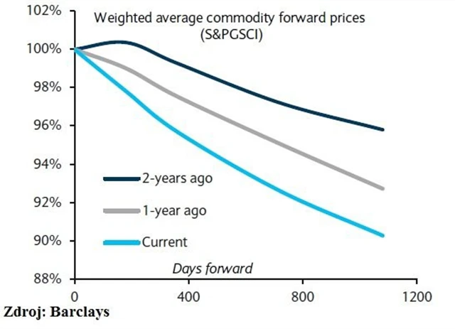 V delším období by však mohly být oproti očekávání velké části trhu komodity podporovány jednak uplatněním reforem v Číně směrem k dynamičtějšímu tržnímu prostředí, a jednak fenoménem cenové struktury komoditních kontraktů pozorovaném za poslední roky. To znamená, že oproti lednu 2012 a 2013 se relativně více komoditních trhů nachází v takzvaném backwardation (vyšší ceny bližších kontraktů oproti těm se časově vzdálenější dodávkou – poptávka je buď vyšší v tuto chvíli, nebo zásoby omezenější, či kombinace obojího). 10 z 24 hlavních komoditních trhů je nyní v tomto stavu backwardation oproti 6 ve stejném období minulého roku a 4 v roce 2012. Podívejme se na vývoj forward křivek například u komoditního indexu S&P Goldman Sachs (světle modrá představuje současný stav):
