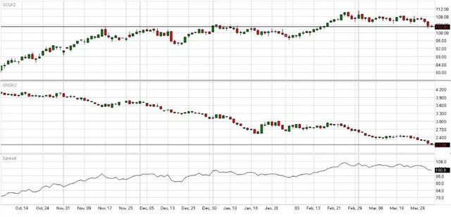 Dále je velice zajímavý neustálý pokles ceny zemního plynu, která se dostala na 10leté minimum. Předpokládá se, že by plyn mohl do určité míry ropu jako zdroj energie nahrazovat. I když producentské ropné společnosti obecně věří v budoucí vyšší ceny, tato možná alternativa je nutí zajišťovat cenu ropy na roky dopředu a prodávat kontrakty s dodáním v letech následujících, což přispívá k rozšiřování výše uvedeného spreadu. Tak se nechme překvapit, co nám budoucnost přinese.