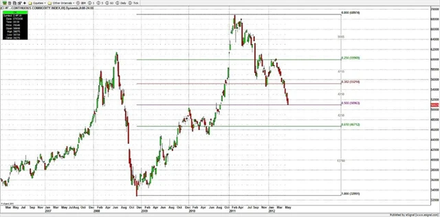 Continuous Commodity Index (CCI), který investoři často používají k získání širšího pohledu na komoditní trhy, je na zajímavé úrovni. CCI je vnímán jako hlavní benchmark komoditních cen, skládá se ze 17 komoditních futures kontraktů. V současnosti je na 50% Fibonacciho retracementu uptrendu, který trval od listopadu 2008 do dubna 2011.