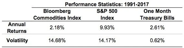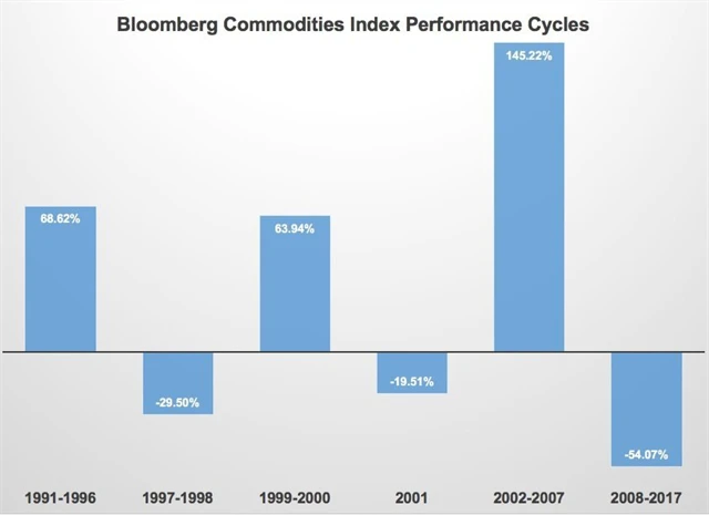 Při pohledu na výkonnost komoditního indexu agentury Bloomberg od roku 1991, kdy vznikl, je jasné, že z dlouhodobého hlediska nejsou komodity v porovnání s akciemi, a dokonce ani s hotovostí až tak skvělou investicí, jakou se zdály být před několika lety.