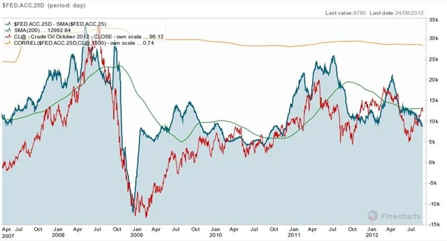 Nahoře je pak korelace mezi cenou ropy a operacemi Fedu. Za 1 500 dnů průměrná korelace 0,74. Tím je řečeno vše. Fed si pohrává s cenami ropy (a aktiv obecně), jak potřebuje. A není v tom sám. Momentálně, jak je vidět z grafu, aktivita Fedu polevila, ale jak všichni víme, byla bohatě nahrazena činností Evropské centrální banky a japonské centrální banky BOJ (která touží po tom srazit kurz JPY dolů). Připomíná to doby socialismu u nás, kdy se plánovaly pětiletky. Dnes si politici, bankéři a vlivní lobbisté plánují, jak by se kapitálové trhy ve světě měly vyvíjet. O svobodném volném trhu nemůže být řeč.