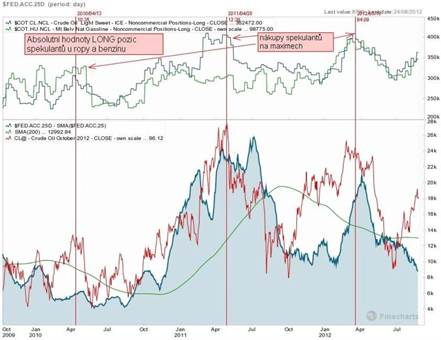 Graf 3: Nákupní pozice spekulantů u ropy a benzínu - absolutní hodnoty