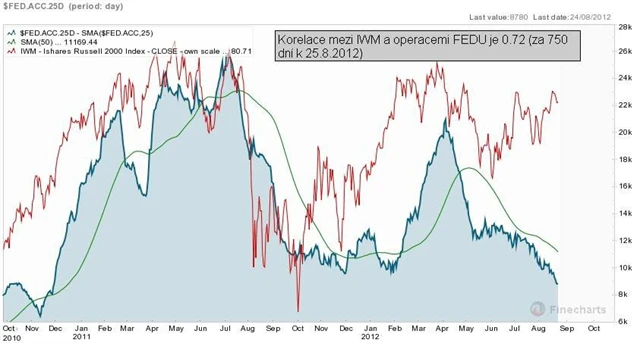 Poslední graf ukazuje závislost akciového trhu na aktivitách Fedu. Modře jsou operace Fedu, červeně je znázorněn certifikát IWM představující akciový index Russel 2000, tedy 2 000 menších společností z amerického trhu. Korelace za poslední tři roky je 0,72 (tedy velmi vysoká).