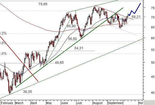 V pondělí pokračoval růst, ukázalo se, že prolomení několika týdenního sestupného trendu je platné. Cena se vyšplahala nad klesající trendovou linii a dosáhla ceny 71,61 ZSD, kde je první rezistence. To vedlo ke konsolidaci, při které cena neudržela jasný intradenně rostoucí trend.