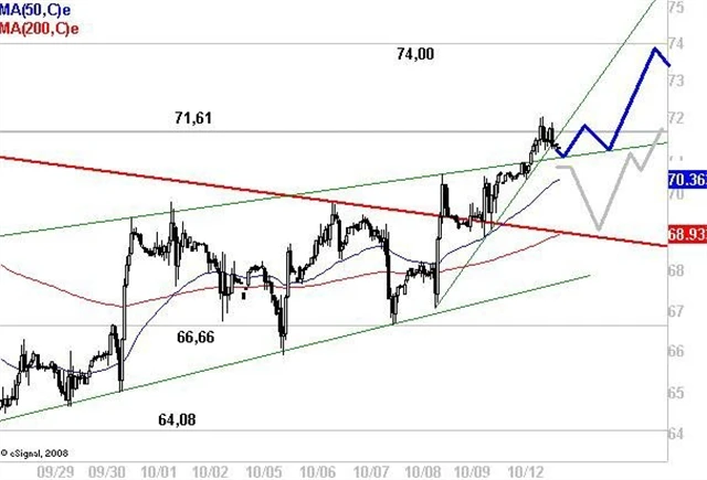 Pokud by na hodinovém grafu cena poklesla platně pod 71,00 USD, může následovat pokles až k 69,00 USD.