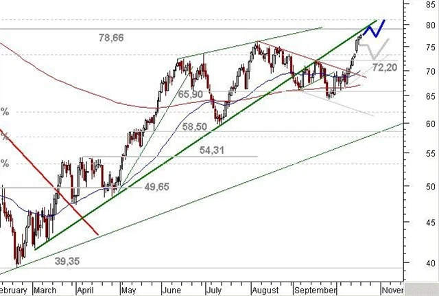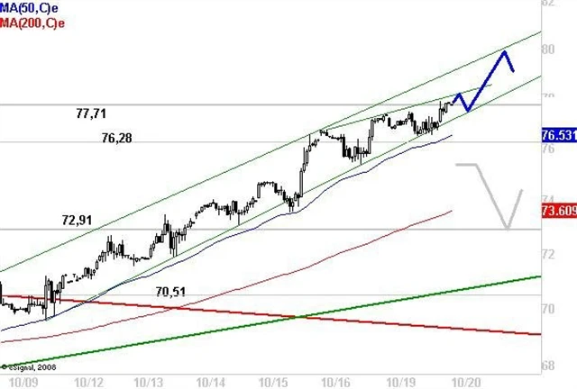 Také na začátku tohoto týden pokračuje plynule rally na ceně ropy. Podle očekávání se cena na začátku obchodování pohybovala mezi rezistencí 77,71 USD a podporou 76,28 USD. Byl tak portvzen růstový trend předešlého dne a poté cena vyšplhala na nová maxima.