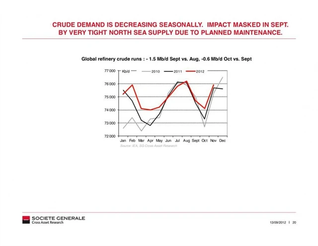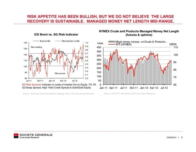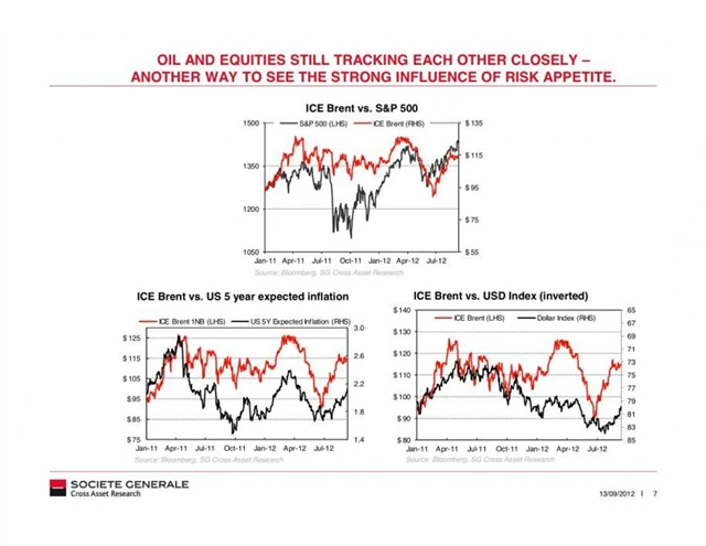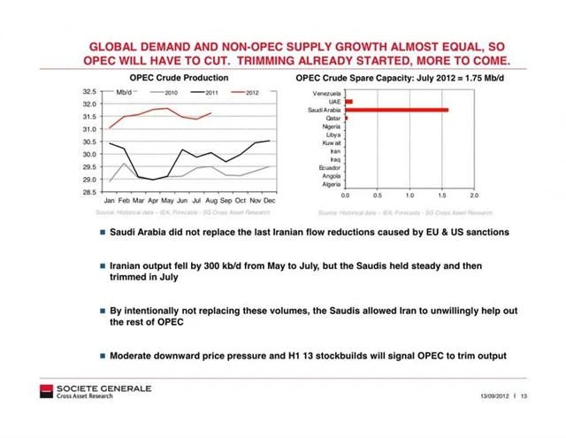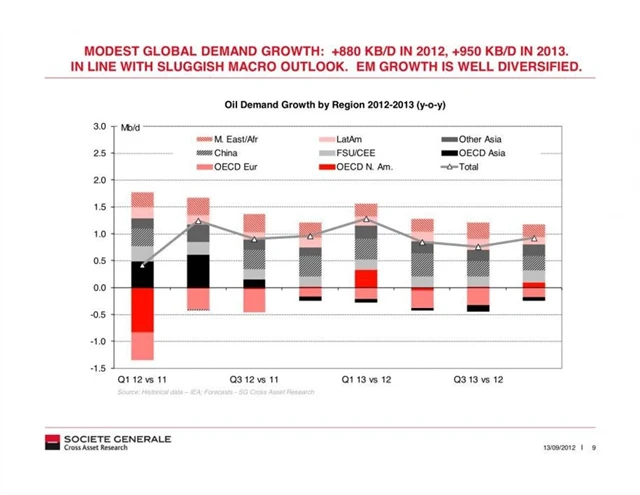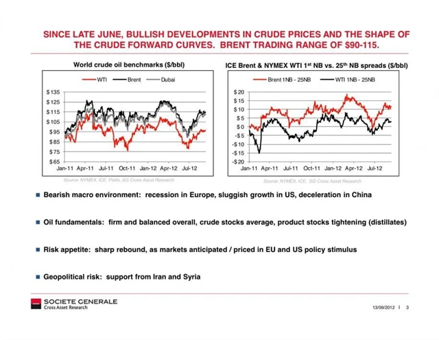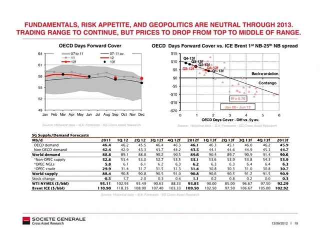 Hlavní komoditní stratég Société Générale Mike Wittner nedávno zveřejnil nedávno svoji prezentaci s výhledem na trh s ropou v roce 2013. Jeho předpověď pro nejdůležitější světovou komoditu je mírně pesimistická. Slabé makroekonomické prostředí určuje strop pásma, v němž se ropa obchoduje. Výslednou cenu budou určovat hlavně geopolitická rizika v Íránu a Sýrii spolu s tržními očekáváními dopadů evropské a americké stimulační politiky centrálních bank.