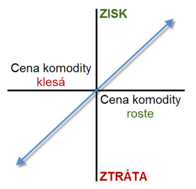 Graf ukazuje výnosovou křivku futures kontraktu. Na ose x je kurz komodity a na ose y zisk nebo ztráta. V místě protnutí os je nákupní kurz (pokud pomineme komisi). V případě vzestupu ceny roste zisk, v případě poklesu ceny roste ztráta.