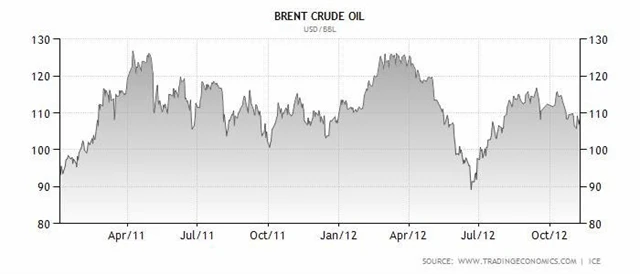 Ropa Brent se v roce 2012 obchoduje zatím v průměru za 112 dolarů za barel. Očekáváme, že průměr za celý rok se bude blížit 110 dolarům, do konce roku se její cena proto bude pohybovat mezi 105 a 110 dolary za barel.