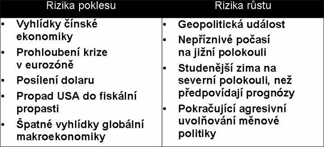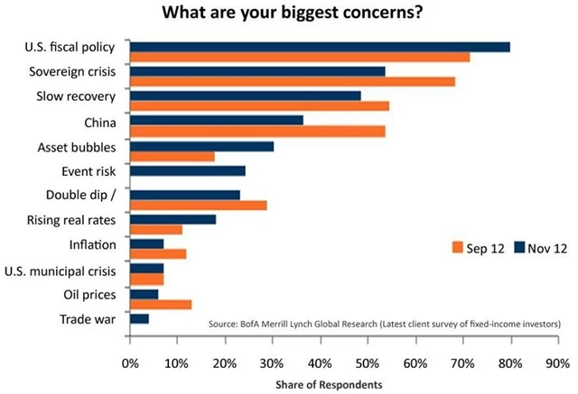 Poznámka: Rizika spojená s ropou (růst ceny ropy) v posledních týdnech mezi americkými investory příliš nerezonují. Ukazuje to například výsledek listopadového průzkumu, který provedla Bank of America Merrill Lynch. Fiskální útes dominuje.