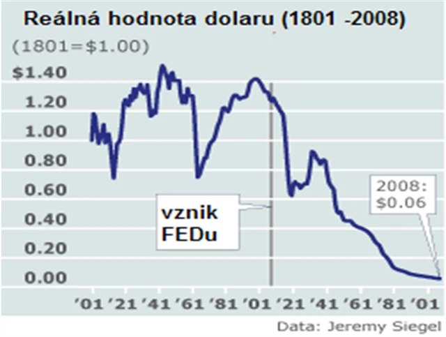 Nebo cena zlata může odrážet příběh hodnoty dolarové bankovky z roku 1801. Cena dolaru během 19. století kolísala, nakonec však skončila téměř na začáteční hodnotě. V 20. století se cena dolaru propadala a skončila až na 0,056 dolaru v porovnání s rokem 1801. Minulé století bylo jednoznačně stoletím inflace. Za tuto diskontinuitu může být zodpovědná Americká centrální banka (FED), jejíž činnost začala v roce 1913.