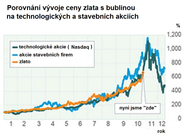 Zlato v posledních dnech předvádí velmi strmý růst, ve kterém láme jeden rekord za druhým. Včera se dokonce dostalo na chvíli přes 1900 USD za unci. Růst zlata však nezačal s debatou o návratu recese na jaře 2011, ale trvá přes deset let a je velmi podobný růstu technologických akcií (NASDAQ) v devadesátých letech minulého století a také prudkému posilování akcií stavebních společností v letech 1995 až 2006.