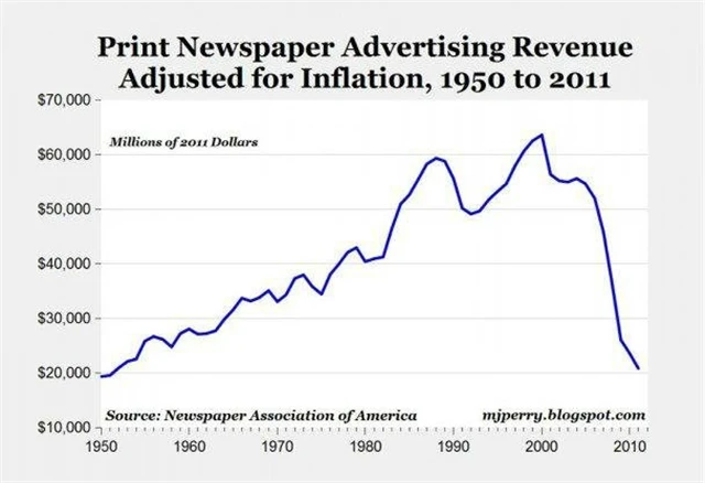 Odklon inzerentů od tištěných novin a jejich láska k Internetu a dalším kanálům není ničím novým. Je ovšem překvapivé, jak obrovský propad v oblasti tištěné inzerce nastal. Ukazuje to například graf tržeb amerických vydavatelů tištěných periodik za reklamu. Za zmínku stojí fakt, že je celá statistika přepočítána na dolary z roku 2011. A o ztrátě hodnoty dolaru za uplynulá desetiletí jsme psali již mnohokrát. Ruce pryč od novin, ani v České republice, která je v marketingu o několik let pozadu za vyspělým světem, se novinám v 21. století nedaří odrážet nástup elektronických alternativ.