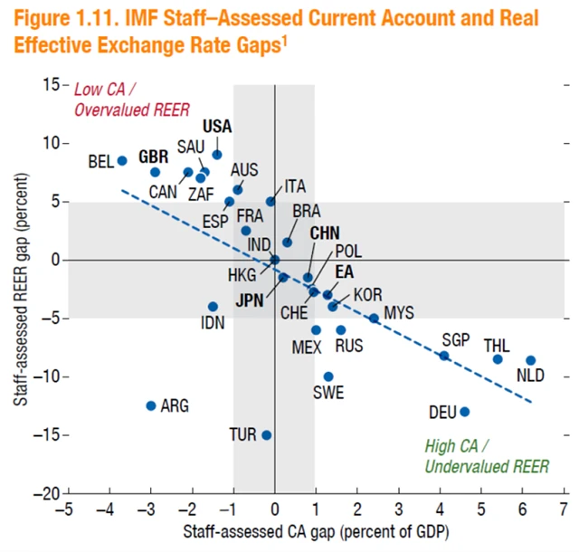 Ale zpátky k dolaru zmíněnému v úvodu. Nadměrný deficit totiž MMF dává do souvislosti s takzvanou mezerou reálného kurzu měny. Například USA, které mají nadměrný deficit, mají podle odhadů i nadhodnocený reálný kurz dolaru. Přebytkové Německo má naopak kurz citelně podhodnocený, těží tak ze slabého eura.