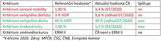 Česká republika bez problémů dlouhodobě splňuje poslední dvě zmíněná kritéria, tedy sazby a veřejný dluh. Naopak v současnosti nesplňuje inflační požadavek, vývoj cenové hladiny u nás se podstatně rozchází s vývojem spotřebitelských cen v eurozóně. Rok 2020 bude navíc velice specifický a deficit rozpočtu dosáhne o řád vyšší úrovně, než se před krizí čekalo.