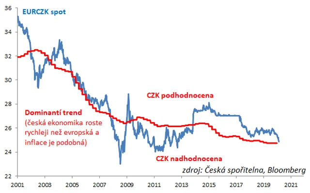 Česká koruna dohání se zpožděním posílení, které se všeobecně čekalo již v letech 2017-2018. Kurz EUR/CZK se po velice dlouhé době vrací do blízkosti neutrální úrovně. Naposledy byl takto blízko 7. listopadu 2013 těsně před 13.00, tedy před oznámením intervencí ČNB. Bylo to na jiném kurzu, v mezičase se totiž neutrální úroveň posunula (změny neutrálního kurzu jsou dané rozdílem růstu české ekonomiky a HDP eurozóny, a to při současném zohlednění inflace).