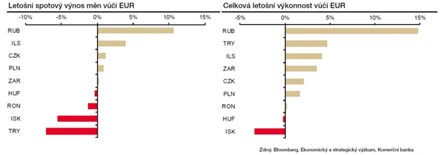 Pokud zohledníme úrokové výnosy, žebříček nejvýkonnějších měn rozvíjejících se trhů se lehce změní. Nadále mu ovšem bude vévodit rubl s eurovým ziskem téměř 15 %, koruna pak spadne na páté místo se stále solidním výnosem přes 2 %.