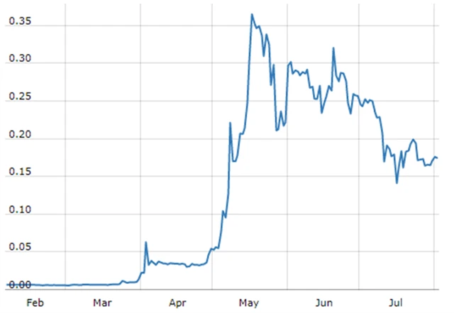 Z hodnot kolem 0,006 USD na začátku roku vyskočila hodnota ripplu v květnu na svá dosavadní maxima nad 0,35 USD (+6 000 %), aby následně měna podstatnou část těchto zisků odepsala.