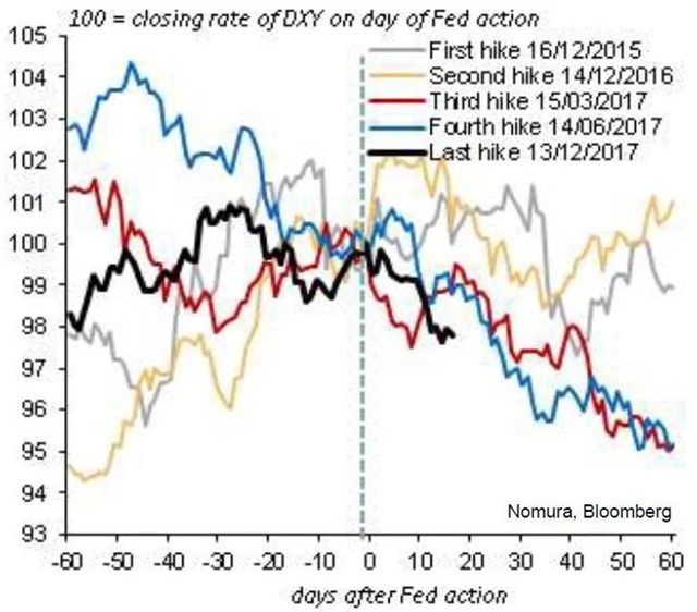Zatímco vývoj hodnoty dolarového indexu v době před zvýšením základní sazby Fedu je víceméně smíšený, po samotném zvednutí úroků jej nelze označit jinak než jako (víceméně) nepříznivý. Copak vyšší sazby nemají danou měnu činit atraktivnější?
