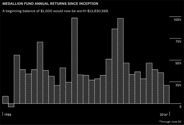 To, že na kvantitativním investování něco bude, dokazuje právě i fond Medallion, jehož výnos s výjimkou prvních dvou let fungování ani po odečtení vysokých poplatků za jeho správu nikdy nespadl pod 21 %. Nejvíce fond investory potěšil v letech 2000 a 2008, kdy vložený majetek zhodnotil o 98,5 %, respektive o 98,2 %.