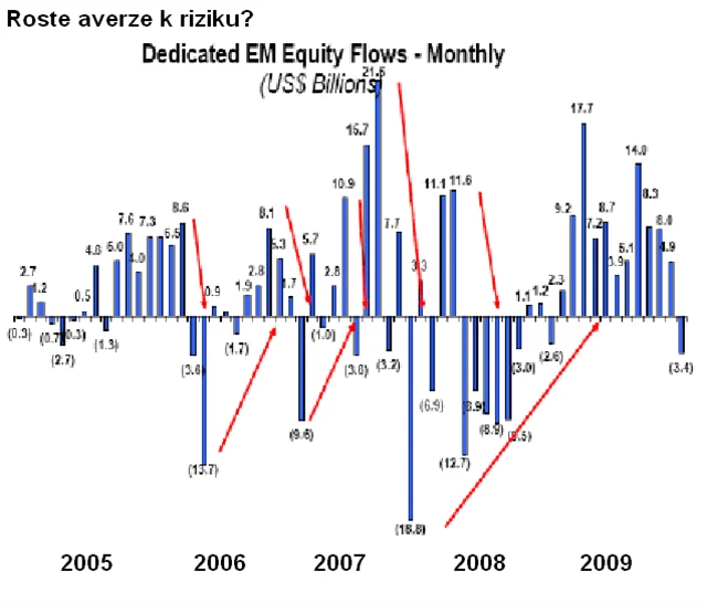 Poprvé od loňského března v lednu ubylo peněz ve fondech mladých akciových trhů (viz graf Roste averze k riziku?). V roce 2009 přiteklo do fondů přes 82 miliard amerických dolarů. Další zpomalení ve výhledech zisku může vést k dalšímu růstu averze k riziku,a tedy úbytku investic do akcií v regionu.
