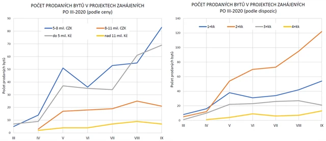 Podívejme se na pražské rezidenční projekty, jejichž prodej začal po březnu 2020. Nejžádanější jsou byty v kategorii 5-8 milionů korun. Roste zájem také o byty do 5 milionů korun. Slabší zájem zaznamenáváme pouze v kategorii nad 8 milionů korun, přičemž v ní dochází od srpna ještě k drobnému poklesu.