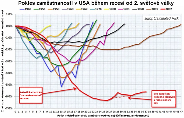 Celková míra nezaměstnanosti ve Spojených státech klesla v lednu na rovných devět procent, tedy skoro o půl procentního bodu. Ale růst počtu pracovních míst je varovně pomalý, mimo zemědělství bylo vytvořeno jen 36 tisíc pracovních míst. A ačkoli se dá čekat revize směrem nahoru (podobně jako v prosinci z původních 103 na 121 tisíc), celkový vývoj nezaměstnanosti od jejího minima je nejhorší během všech recesí, které Amerika zažila od 2. světové války. A investoři to chápou - futures na americké akciové indexy po zveřejnění zprávy zamířily prudce dolů.