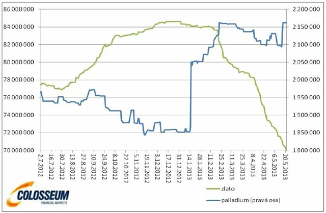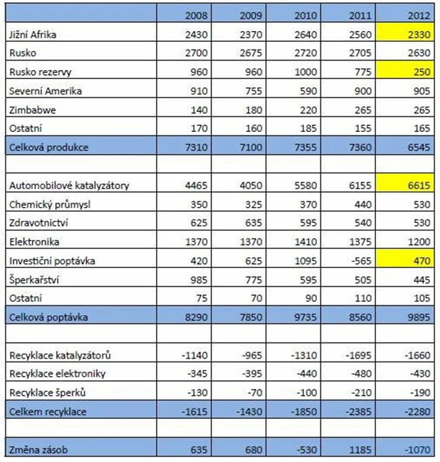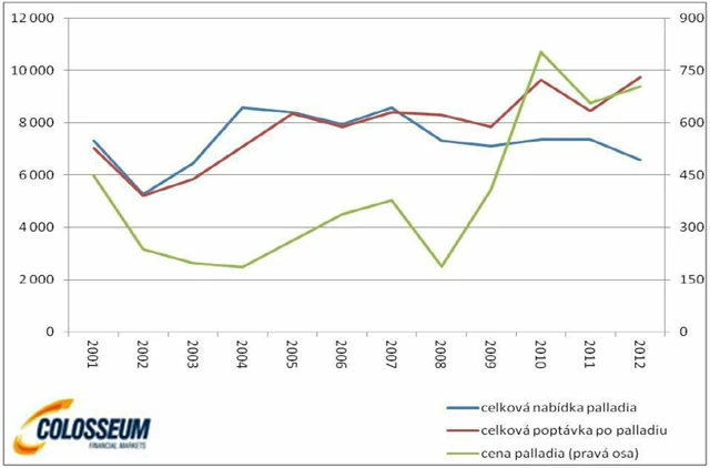 - Přes 70 % koncových nákupů paládia bylo v roce 2012 určeno pro automobilové katalyzátory. To činí trh značně závislým na jednom odvětví. Ochlazení hospodářského růstu v Číně by mohlo přinést výrazné zpomalení růstu produkce automobilů i průmyslové poptávky po paládiu.