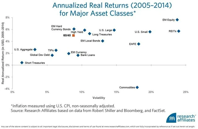 Chris Brightman z Research Affiliates srovnal výkonnost tradičního portfolia 60 ku 40 s výkonností 16 tříd a typů aktiv v posledních 10 letech. Portfolio s 60% zastoupením akcií a 40% podílem dluhopisů za tu dobu vykázalo průměrný roční výnos 7,2 %, čímž překonalo devět ze šestnácti srovnávaných tříd a typů aktiv. Ve prospěch portfolia 60 ku 40 navíc hovoří i to, že v průběhu celého sledovaného období vykazovalo výrazně nižší volatilitu než ostatní varianty.