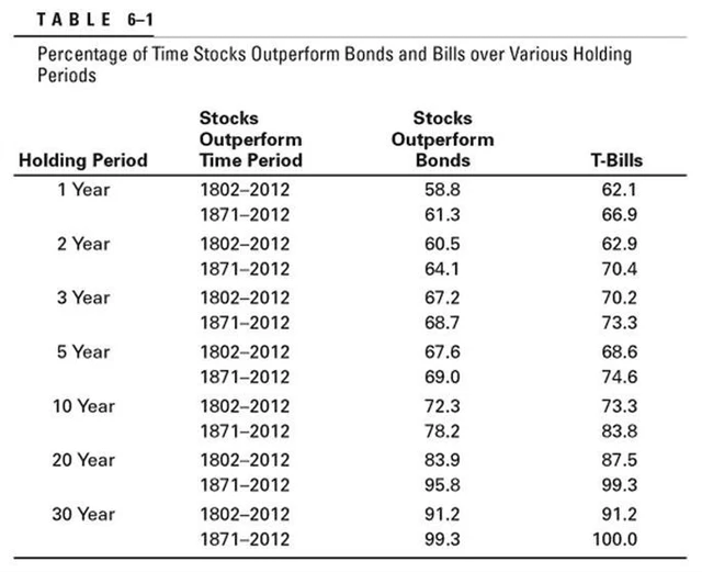 Z tabulky otištěné v Siegelově knize "Akcie pro dlouhé období" (Stocks for the Long Run) plyne, že akcie překonaly dluhopisy i krátkodobé poukázky, které slouží jako ekvivalent hotovosti, v 30letém období téměř vždy.