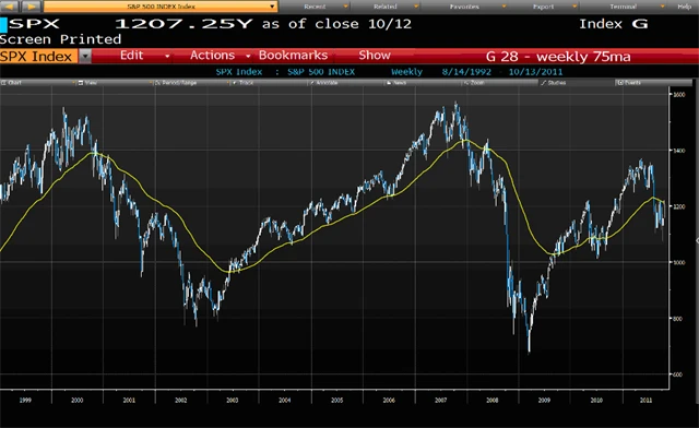 Týdenní graf indexu S&P 500 od roku 1999 po současnost (12. října) a jeho 75denního klouzavého průměru (žlutá linka) ukazuje, že je právě tento průměr důležitou hladinou podpory (supportu). V současnosti se index k této úrovni přiblížil zespoda na velmi malém objemu. Tato úroveň bude pravděpodobně několik dní nebo týdnů odolávat. Je také možné, že nedávná několikadenní a velmi razantní rally na této úrovni skončí a zažijeme ještě letos nová minima. Tomu by nasvědčoval malý objem obchodů během zmíněné rally, která byla vyvolána především zavíráním krátkých pozic (short-squeeze).