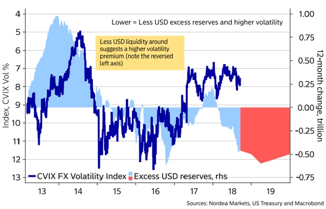 Americká centrální banka postupně snižuje likviditu, kterou v rámci QE poskytovala trhům, takže na mezibankovním trhu je stále méně dostupných dolarů. Postupná splatnost dluhopisů v držení Fedu znamená stahování dolarů z oběhu, což by mělo vést k postupnému růstu hodnoty dolaru. Silnější americká měna bude mít negativní vliv nejprve na rozvíjející se trhy, pak přijdou na řadu i vyspělé ekonomiky. Další na řadě jsou riziková aktiva, která přestávají být vzhledem k vyšším sazbám Fedu pro investory tak zajímavá. To vše povede ke zvýšení volatility v roce 2019, protože na aktuálních úrovních se zkrátka udržet nemůže.