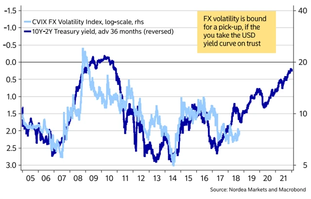 Výnosová křivka v USA naznačuje závěr růstové fáze ekonomického cyklu. Možná je to kvůli dlouhému působení kvantitativního uvolňování tentokrát jinak, právě tato nedůvěra ve výnosovou křivku pak může vést k nízké volatilitě. Když jí ale budeme věřit, výnosová křivka říká, že do recese v USA zbývají dva roky. A ohledně volatility vzkazuje, že v následujících třech letech bude její růst na měnovém trhu nezanedbatelný.