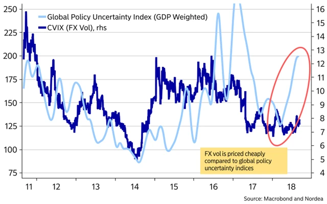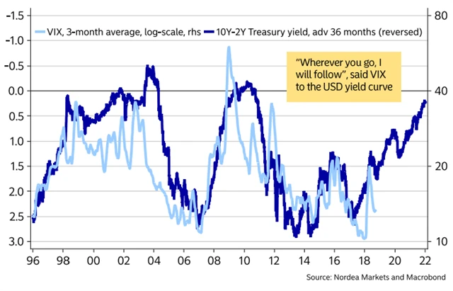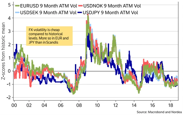 Podle grafů se zdá, že je volatilita opravdu nízká. A ačkoli se historie nemusí opakovat, v určitých intervalech si některé etapy bývají podobné. Vzhledem k tomu, že jsou v současnosti rizika podle Nordea Bank oceněna níže, než je vnímá samotná banka, její analytici jsou ve výhledu na rok 2019 opatrnější než v minulosti.