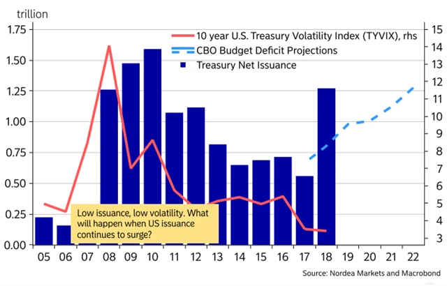Index TYVIX měřící volatilitu na trhu s 10letými vládními dluhopisy USA je na historickém minimu, a to přesto, že čisté emise bondů rychle rostou. Vzhledem k rostoucím nákladům na zajištění pro zahraniční investory, hrozbě růstu deficitu USA (a růstu objemu nově emitovaných dluhopisů) je současná nízká volatilita překvapivá. V roce 2008, kdy ministerstvo financí emitovalo dluhopisy stejným tempem, byl TYVIX nad 13 body. Na současných hodnotách mezi 3 a 4 body malá kolísavost jednoduše není (vzhledem k podmínkám na trhu a v ekonomice USA) udržitelná.