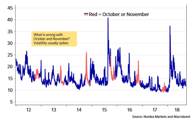 Vedle toho, že hrozí neúspěch ve vyjednáváních o dluhovém stropu, u volatility funguje také sezónnost. Kromě roku 2015 došlo v posledních letech v říjnu či listopadu pokaždé k nárůstu volatility.