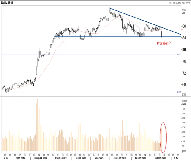 Na grafu ceny akcií JPMorgan se formuje sestupný trojúhelník (dvě modré přímky). To ještě nutně nemusí být prodejní signál. Pokud však bude trend pokračovat, proražení pod podporu by takovým signálem bylo. Jeho potvrzením by byl zvýšený objem obchodování.