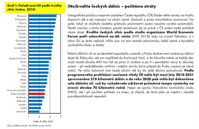 Geografická poloha a exportní zaměření České republiky kladou velké nároky na kvalitu dopravní sítě a její napojení na okolní země. Zaslouží si proto mimořádnou pozornost. Tím spíše, když ve struktuře českého průmyslu prominentní pozici zaujímá výroba automobilů. Téměř ironicky v tomto kontextu působí skutečnost, že se právě v Česku autem nejezdí zrovna dobře. Kvalita silnic řadí ČR podle studie Světového ekonomického fóra celosvětově na 68. místo, tedy na úroveň Pákistánu, a v rámci EU je šestá nejhorší. Hůře jsou na tom v unii vesměs ekonomicky slabší země z bývalého východního bloku a Malta.