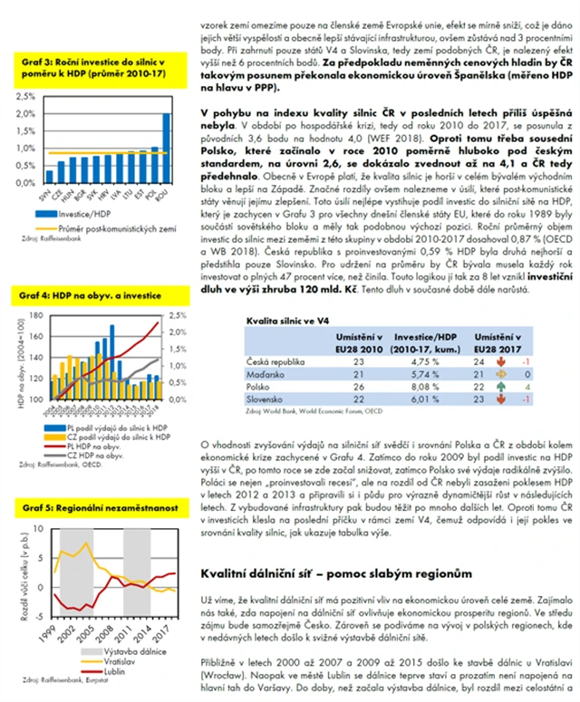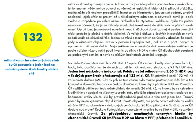 - Posun v indexu kvality silniční sítě o jeden bod by podle vzoru Polska vyžadoval výdaje v objemu zhruba 2,65 % HDP ČR (132 miliard Kč). Za tuto částku by bylo možné postavit přes 850 km dálnic, a tím kompletně dokončit jejich plánovanou síť v zemi.