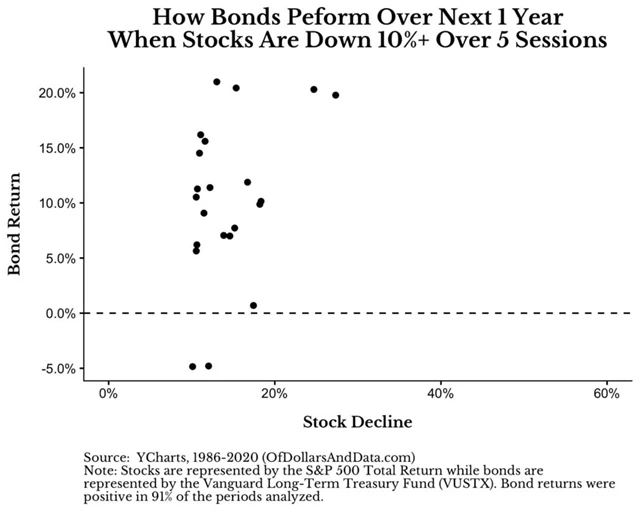 Když americké akcie zaznamenaly alespoň 10% pokles za týden (a to je velice aktuální situace), americké bondy zpravidla v následujícím roce zpevnily.