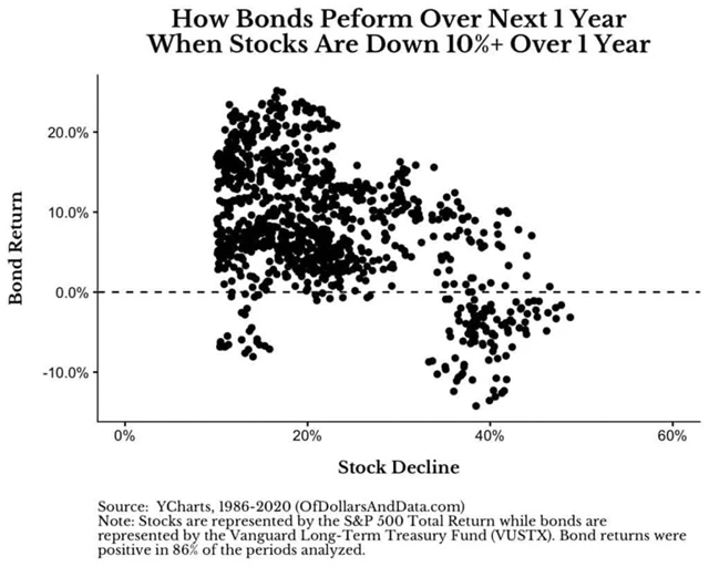 1. Když akcie ztrácejí, dluhopisy mají tendenci posilovat