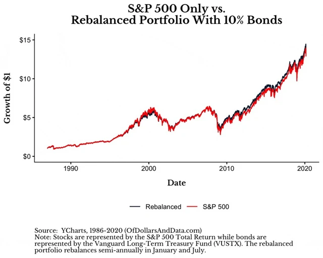 Následující graf (jako ostatně všechny) není zárukou, že něco obdobného bude fungovat i v budoucnu, zajímavý ale je. Ukazuje, že navzdory nižší výkonnosti dluhopisů samotných může portfolio namíchané v určitém poměru z dluhopisů a akcií (a pravidelně vyvažované, v příkladu vždy v lednu a červenci) překonat výkonnost akciového indexu. Především to samozřejmě platí pro období, kdy akcie prudce oslabují.
